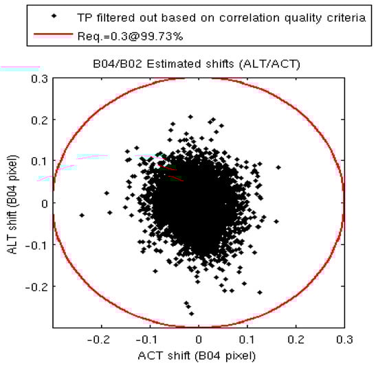 The multispectral registration performance is continuously monitored: a degraded performance could indicate the need to recalibrate the line of sight. The method uses cloud-free images over flat terrain. Matching image patches between different spectral bands are identified and the shift vectors are computed. Point cloud plots are produced to identify potential biases (see Figure 6 below) and along-track Fourier transform of the error is used to detect potential oscillations in the line of sight.