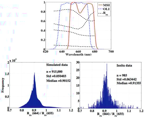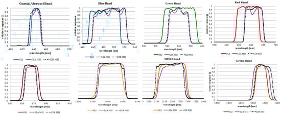 Because the two instruments have significant overlap in spectral bandpasses (see Figure 7), these differences must be accounted for through use of a spectral band adjustment factor (SBAF; [21]). The SBAF is target specific and requires a source of hyperspectral image data to calculate. Using the SBAF, the MSI reflectances can be converted to OLI equivalent reflectances.