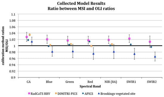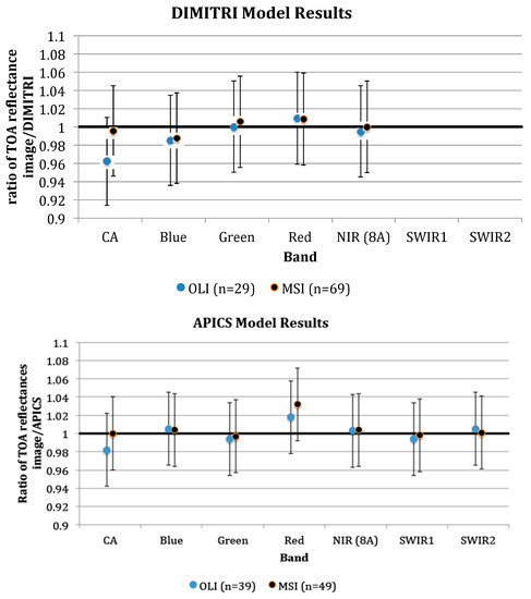 Two different models are being used to predict the TOA reflectance of the PICS regions using hyperspectral satellite data as the source of the “field” data. The models consider the atmospheric conditions, BRDF, and solar and viewing geometries in converting hyperspectral TOA reflectances to multispectral TOA reflectances (either OLI or MSI bandpasses). The South Dakota State University Absolute PICS (APICS) model uses Hyperion data [23], and the ESA Database for Imaging Multi-spectral Instruments and Tools for Radiometric Intercomparison (DIMITRI)-PICS model uses Medium Resolution Imaging Spectrometer (MERIS) data [16]. Results using these models are shown in Figure 9 and indicate that the two instruments are calibrated to within 2% of each other, except for possibly the CA band.