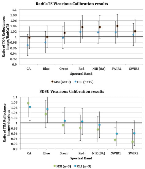 Two teams in the United States have been acquiring reflectance measurements of the surface under OLI and MSI: University of Arizona (UAz) at the Railroad Valley Playa, Nevada (RRV), and South Dakota State University (SDSU) at the Brookings, SD, site [24,25]. In both cases, the software MODTRAN (Moderate Resolution Atmospheric Transmission) is used to predict top-of-atmosphere reflectance from the surface measurements, which are then compared to the reflectance measured by OLI and MSI. See Figure 10. Results of these calibration efforts suggest, once again, that the two instruments are calibrated consistently with respect to each other in the order of 2% or better. However, absolute calibration uncertainties are somewhat larger, though consistent within their respective methodologies.