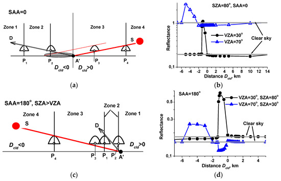 Analyzing variations in reflectance outside Zone 2, we consider two situations: SZA > VZA, see Figure 2c, and SZA < VZA, see Figure 2e. When SZA = 80° > VZA = 30°, the shadow region (Zone 3) occurs between points and . For the case when SZA = 30° < VZA = 70°, LS is shaded when the cloud moves from to . As in the SAA = 0 case, outside Zones 2 and 3, radiances and agree within the relative calculation error, as shown in Figure 2d.