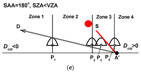 Point is the boundary between Zones 2 and 3: When the cloud leaves LS, no extra attenuation of radiation by the cloud along this direction occurs, as shown in Figure 2a. As the cloud moves in Zone 3 from P2 to P3, the inequality < holds because a part of the line of sight is shaded, with the length and position of the shaded part on ray A′D varying. As the cloud center moves from point to point , the observation point A′ is within the cloud shadow zone. This circumstance can also influence the relationship between and , especially for surface types with large .