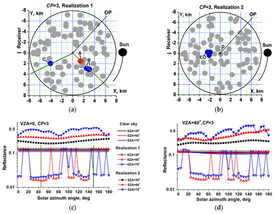 (a,b) Schematic image of two cloud realizations, and the dependence of reflectance on solar azimuth angles at (c) VZA = 0 and (d) VZA = 60° for different solar zenith angles, 0 ≤ SAA ≤ 180°; CF = 3, λ = 2.15 µm. Note: VZA is the viewing zenith angle, SAA is the solar azimuth angle and CF is the cloud fraction.