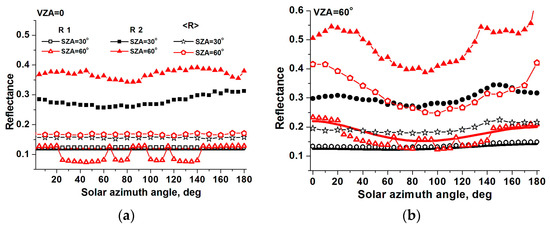 Assume that CF = 3, see Figure 7a. When SZA = VZA = 30°, exceeds by about 10% owing to the dominating role of cloud top in the formation of the field of reflected radiation.