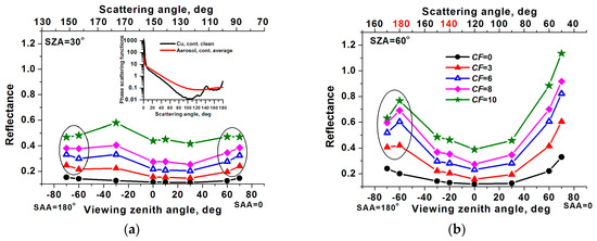 Reflectance under the conditions of clear sky and overcast clouds and mean reflectance at CF = 3, CF = 6, and CF = 8. The cross section in the principal plane; (a) solar zenith angle (SZA) = 30° and (b) SZA = 60°. The negative viewing zenith angles are toward the Sun (SAA = 180°) and the positive angles are toward the antisolar location (SAA = 0), = 10. The inset in panel (b) shows scattering phase functions of cloud and aerosol particles ([55], λ = 0.55 µm).