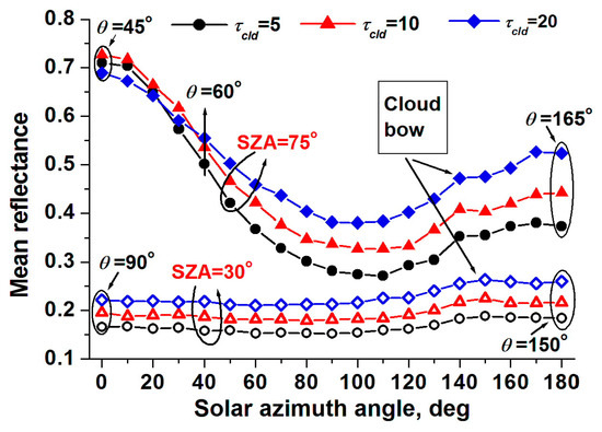 A slightly different situation is observed in broken clouds. The formation of an angular structure of reflected radiation is affected by the presence of non-horizontal cloud surfaces: Radiation leaving through lateral cloud sides undergoes less scattering events and, as such, is more sensitive to the angular structure of the scattering phase function. Therefore, at SAA = 180°, owing to the presence of a peak in the rainbow region θ = 142°, mean reflectance increases as the viewing zenith angle grows from VZA = 60° to VZA = 70° at CF = 3 and CF = 6, in contrast to overcast clouds, as shown in Figure 6a. In the antisolar location (SAA = 0), the growth of with decreasing scattering angle causes mean reflectance to increase with growing VZA.