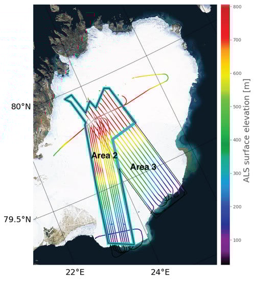 In April 2016, as part of a CryoVEx airborne campaign, parts of the Austfonna ice cap were measured by near-infrared (904 nm) ALS. The measurements were carried out on 15–16 April 2016 from a Twin Otter airplane, which also carried the Airborne SAR/Interferometric Altimeter System (ASIRAS) radar [23]. The flight pattern and the measured surface elevations are shown in Figure 1. The waypoints for the flight were designed to be centered around two CS2 orbits (31,971 on 19 April and 32,066 on 26 April), and the extent of the grid was chosen so that it would cover most of the CS2 data from these orbits as well as part of a couple of other CS2 tracks crossing the ice cap in April. As seen in Figure 1, the grid for the western part (center line being track 32,066) was designed with closer line spacing than the eastern grid (center line being track 31,917). This was to accommodate the different topography in the two areas, which results in a greater deviation of the CS2 ground measurements from the satellite nadir position in the eastern compared to the western part. The western grid has a line spacing of 1 km while the eastern grid has 2 km line spacing. The easterly grid was partially re-surveyed during the 2017 CryoVEx airborne campaign. For this validation analysis, the 2016 CryoVEx ALS data were averaged from their original swath width of 300 m and 1 × 1 m resolution to a lower resolution of approximately 100 m × 100 m. This was done with a simple procedure, by deriving the mean elevation in segments of a chosen size, with no outlier rejection applied. This averaging was done to remove small-scale topography and to produce a spatial resolution comparable to CS2. The data shown in Figure 1 are the averaged heights.