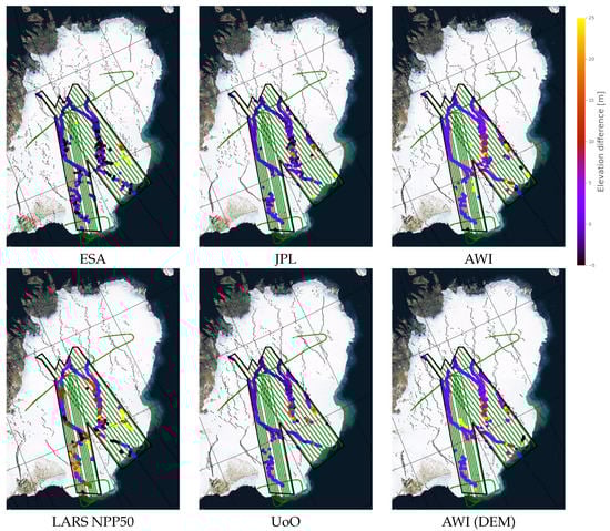 From the spatial maps of the CS2-ALS elevation differences (Figure 2), we can see more specifically where the different data sets’ performances are good and where they are degraded. In general, we see that all six data sets showed better agreement with the western-most ALS grid (area 2), compared to the eastern one (area 3). This is probably due to the more gentle topography in the Western region compared to the Eastern part. The latter covers a surging glacier [35], and the surface here is characterized by rough topography with many deep crevasses, reflected in the standard deviation of area 3 (Table 1). This rough terrain might be challenging for the processors, and in addition may not sample the topography accurately enough with a 2 km grid spacing. To avoid interpolating the ALS data, we attempted to derive statistics on only overlapping or closely separated ALS and CS2 data, but this resulted in a very small data set, which was not suitable for a robust validation.