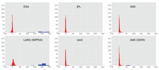 The histograms of the estimates for all 600 common points for the six data sets are shown in Figure 3. The range [−50 m, 50 m] of the values in the histogram are given in bins of 1 m (shown in red), while for values outside this range, the bin size is 25 m (shown in blue). Only UoO did not have absolute differences larger than 50 m, whereas the others had 7, 16, 17, 6, and 40 for AWI, AWI (DEM), ESA, JPL, and LARS respectively.