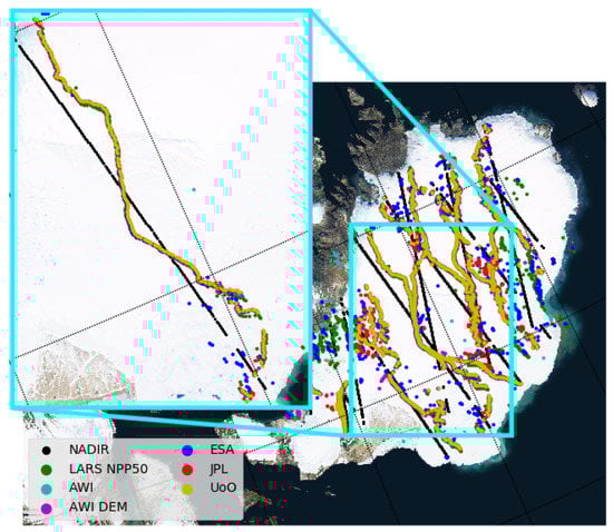 Besides the dedicated land ice processing chains described in the previous sections, we also include a L2 data set generated from a processing chain developed for ocean applications. This data set was generated at the Technical University of Denmark (DTU) using the LARS Advanced Retracking System (LARS) which was originally constructed to retrack CryoSat-2 waveforms in the Arctic Ocean in the presence of sea ice using the empirical Offset Centre of Gravity (OCOG), Threshold, and Beta-5 retrackers. The outputs from the system were tested against shipborne gravity data and showed promising results for CryoSat-2 and the new SAR mode [28]. Since then, additional retrackers have been added to LARS, which now consists of more than 10 empirical and physical retrackers primarily targeted at open ocean [29,30,31], coastal regions [32], rivers [14], and lakes [13]. For this study, the Narrow Primary Peak Retracker with 50% threshold (NPP50) [31,33] was modified following Villadsen et al. [14] to include geo-location following Abulaitijiang et al. [32], Armitage et al. [34]. Key-points in the processing chains includes: