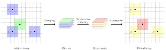 - Dabov, K.; Foi, A.; Katkovnik, V.; Egiazarian, K. Image denoising by sparse 3-D transform-domain collaborative filtering. IEEE Trans. Image Process. 2007, 16, 2080–2095. [Google Scholar] [CrossRef] [PubMed]