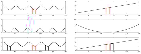 This latter expression, however, holds only for the wrapping-free geometry of Figure A1(left), that is for . In the presence of wrapping, we can exploit the periodicity of the signal, see Figure A1(right), obtaining a more general expression, valid for all values of