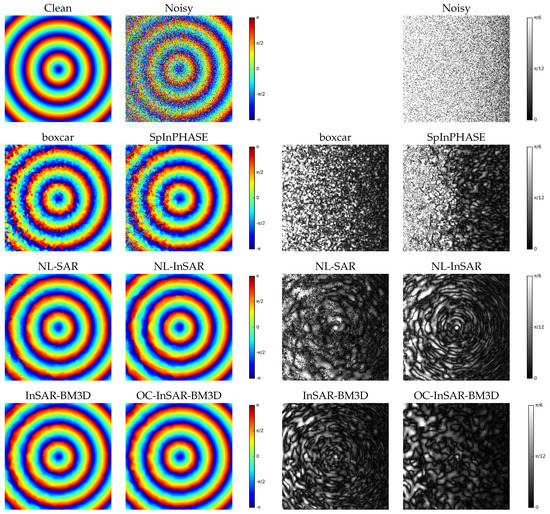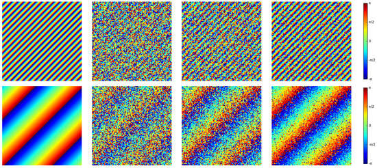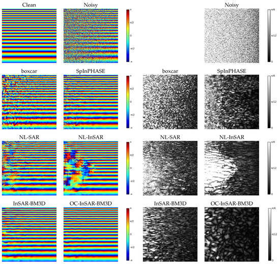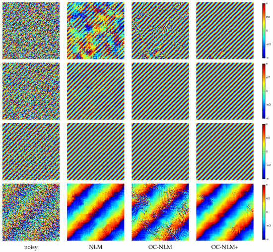 However, to better highlight some basic phenomena, we carried out some preliminary experiments with the much simpler OC-NLM. We wanted to understand how performance depends on noise intensity (hence coherence) and the local signal gradient. Therefore, we simulated simple test phase images, of a small size, 105 × 105 pixels, with constant coherence and phase gradient. In particular, we considered three levels of coherence, , 0.6, and 0.9, corresponding to high, medium, and low-intensity noise, and eight phase gradients with covering from a very fast-varying phase (to the limit of aliasing) to almost a constant phase. Figure 4 shows in false colors some of these test (wrapped) phase images, together with their ideal clean reference.