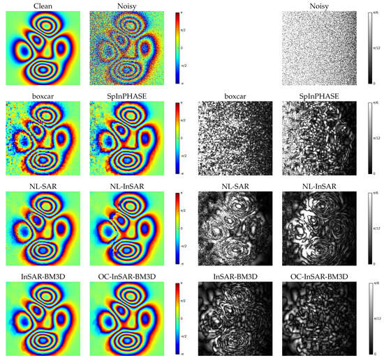In order to gain insight into the dependence of filtering quality on phase noise intensity, the coherence grows linearly from left to right, from a minimum of 0.1 (very noisy) to a maximum of 0.9 (almost clean). Likewise, the amplitude grows from 21 to 255 digital numbers along the y axis, except for the ramp image (fixed amplitude) where the y axis is used to study the dependence on fringe frequency. In Figure 6, Figure 7 and Figure 8 we show, on the first row, the clean reference and the noisy version of the three test images, with the usual false-color representation in . It is clearly shown that the leftmost part of each image is extremely noisy, due to the very low coherence, and represents a very challenging testbed for all methods.