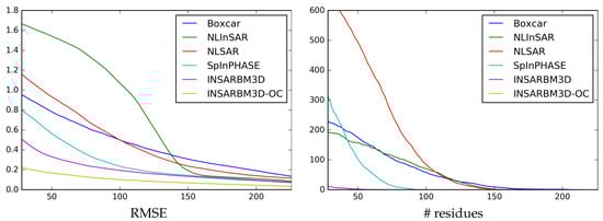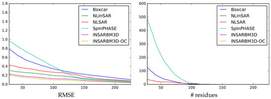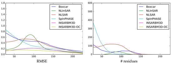 In Figure 6, Figure 7 and Figure 8 we also show, for all methods under test, the filtered images (left) and the difference between these and the clean references, called error images (right). Objective results, in terms of Root Mean-Square Error (RMSE) and number of residuesare instead reported in the graphs of Figure 9, Figure 10 and Figure 11. A residue is a singularity in the interferometric phase due to the presence of noise. The sum of increments of noiseless wrapped phases along a closed path is normally zero, and residues account for paths where this does not happen. Residues may heavily impair phase unwrapping. Hence, a good filter should reduce their number to allow reconstructing the interferometric phase structure. In order to study the dependence on noise intensity, these quantities are computed in sliding-window modality over vertical strips of width 32 pixels. Accordingly, the abscissa refers to the center pixel of the vertical strip, which goes from 28 to 226 to include only complete strips and avoid border effects. Therefore, for example, the RMSE decreases going from the left (low coherence) to the right (high coherence) part of each image. Finally, in Table 1 we report the RMSE and the number of residues computed over the whole image and averaged over ten repetitions of the experiment. The standard deviations, always quite small except for NL-SAR, are shown in parentheses and in smaller font.