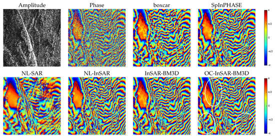 We chose an image that shares many characteristics with the simulated scenes considered before, therefore, not surprisingly, the results confirm most of the previous observations. The boxcar filter cannot work well on such high frequencies, and most phase fringes are lost or distorted through filtering, which may severely impair subsequent phase unwrapping. Furthermore, NL-SAR exhibits the problems highlighted with the Ramp image, uniformly on all clips. On the contrary, the performance gap among the remaining methods is now much reduced. This is especially surprising for SpInPHASE, which was one of worst performers on the simulated data. However, the RMSE graphs of Figure 9, Figure 10 and Figure 11 show for SpInPHASE a bimodal behavior: catastrophic at very low coherence and very competitive at high coherence. Since the Kamchatka image has a relatively high coherence, performance is mostly leveled. Nonetheless, a careful visual inspection reveals some significant differences, consistently in favor of OC-InSAR-BM3D, which is able to provide more regular phase patterns even in regions with very close fringes. To help the reader, we have highlighted with white ovals some regions where such differences can be more easily spotted.