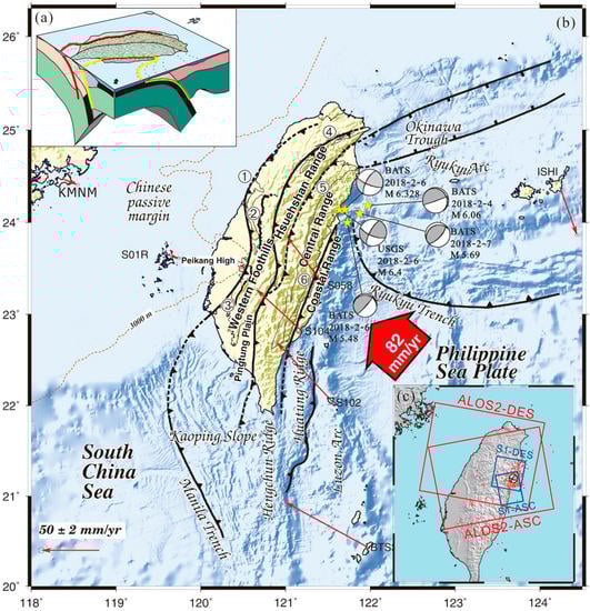 (a) Tectonic setting of Taiwan characterized by opposing subduction systems in the north and south [9]. (b) Main fault systems (the black lines) of Taiwan orogeny. Seven GPS sites (red arrows) located at the Eurasia and Philippine Sea plates are got from the previous study [10], which show a NW directed block motion with an average velocity of ca. 8.2 cm/year [10]. The yellow star indicates the epicenter of the 2018 Hualien earthquake, and the beach balls are the focal mechanisms of the main shocks and major aftershocks of the 2018 Hualien events solved by USGS and BATS based on the New Automatic Full-Waveform Regional Moment Tensor Inversion Algorithm [11]. (c) SAR coverages (the red and blue lines) and aftershocks (red circles) are mapped on the digital Earth model with a high resolution of 30 m.