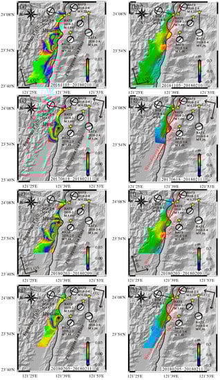 - Huang, M.H.; Tung, H.; Fielding, E.; Huang, H.H.; Liang, C.; Huang, C.; Hu, J.C. Multiple fault slip triggered above the 2016 Mw 6.4 MeiNong earthquake in Taiwan. Geophys. Res. Lett. 2016, 43, 7459–7467. [Google Scholar] [CrossRef]
