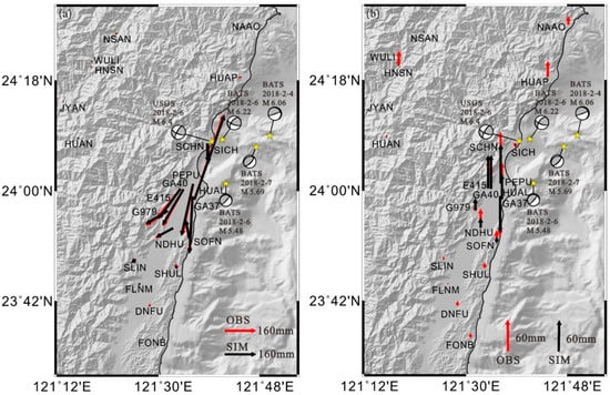 The co-seismic GPS displacements of the 2018 Hualien earthquakes. (a) The GPS horizontal surface displacements in the seismic zone of the 2018 Hualien event. The red vectors are the observed GPS displacements, the black vectors are the predicted GPS displacements based on the co-seismic faulting model shown in Figure 4a, and the beach balls are the focal mechanisms of the main shocks and major aftershocks of the 2018 Hualien events solved by USGS and BATS. (b) The observed (red vectors) and predicted (black vectors) GPS vertical displacements.