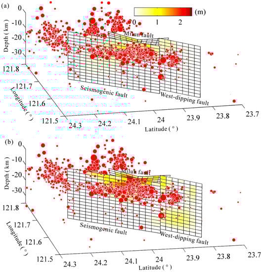 The faulting models respectively inferred by GPS and InSAR observations, and the red dots are the aftershocks of the 2018 Hualien earthquake. (a) The co-seismic faulting model inferred by GPS displacements with a peak slip of ca. 0.9 m. (b) The co-seismic and postseismic faulting model of the 2018 Hualien earthquake, in which the maximum accumulated slip magnitude is up to ca. 2.1 m.