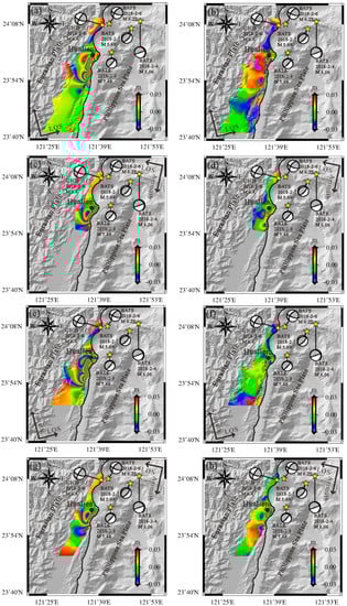 Figure 2b,d,f and h show the absolute InSAR deformation fields of the 2018 Hualien event. It should be noted that both the positive and negative InSAR deformations have been simultaneously detected in the hanging wall along the strike direction of the seismogenic fault (ALOS-2 and Sentinel-1 ascending tracks). It suggests that the measured InSAR deformation should be resulted from a predominant strike-slip event. Moreover, the significant surface deformation is found in the east of the Milun fault, which indicates that this fault should have been triggered by the motion of the seismogenic fault. In addition, the interferometric decorrelation is found in the east of the west-dipping fault, which could be attributed to the shallow fault patch rupture of the west-dipping fault and/or the vegetation cover in this area.