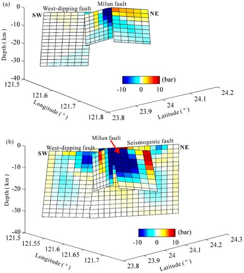 The Coulomb failure stress change on the faults. (a) The CFS change on the two triggered faults including the Milun and west-dipping faults calculated by the co-seismic faulting model of the seismogenic fault (Figure 4a). (b) The CFS change on all the faults calculated by the co-seismic faulting models shown in Figure 4a.