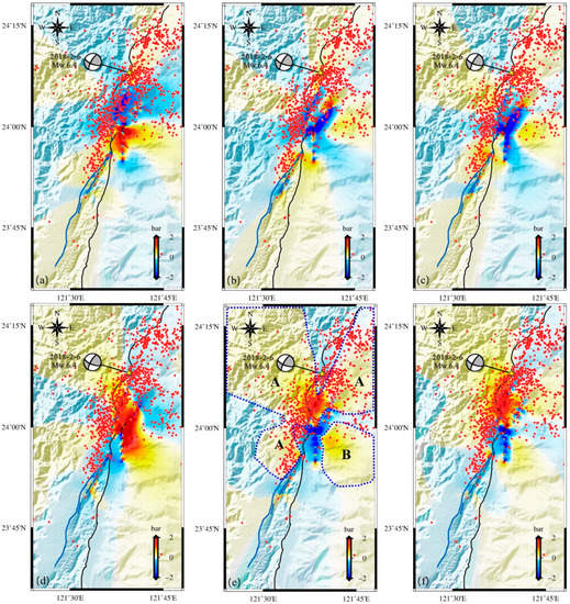 To access the risk of the future seismic hazard in the seismic zone after the 2018 Hualien earthquake, we calculate the CFS change at the depth of 10.0 km that is the average depth of the aftershocks, based on the inferred co-seismic and postseismic faulting model (Figure 4b) using different receiver parameters (see the caption of Figure 8 for the detailed parameters). Figure 8 shows the CFS change fields calculated by different receiver parameters, and it can be found from Figure 8e that the aftershocks have the highest consistence with the distribution of the positive CFS change when the receiver parameters are 135° for the rake angle, 0.1° for the strike angle, and 73.5° for the dip angle that are the same fault geometry as the south segment of the Milun fault, and more than ca. 70% aftershocks occurred in the significant positive CFS change zones of “A” in Figure 8e. The distinguished CFS change of “B” has an average positive CFS change of ca. 0.8 bar, but few aftershocks occur in this zone. Therefore, we hypothesize that there is a high possibility of the future seismic hazard in zone “B”. Figure 8e shows that some aftershocks occur in the negative CFS change zones, we hypothesize that it should result from the dynamic CFS and different CFS receiver parameters.