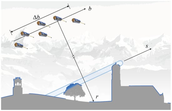 InSAR is the technique of using SAR as an interferometer. Multi-baseline InSAR techniques exploit the interferometric phase (i.e., the phase difference) of multiple complex-valued SAR images. These images are acquired at different satellite positions, time, or frequency, and hence, they create spatial, temporal baselines, or Δ k-radar when forming interferograms. For TerraSAR-X images, such multi-baseline configuration is usually acquired in a repeat-pass manner (hence “multi-pass”), except if the twin satellite TanDEM-X was employed. Figure 2 shows the multi-baseline InSAR configuration in an urban scenario at a fixed azimuth position. The TerraSAR-X satellite flies perpendicular into the screen/paper. The term r indicates the line of sight (LOS), i.e., the slant range direction, of the sensor; s is the elevation direction that is perpendicular to the range and azimuth. The blue outline on the surface indicates the area illuminated by radar pulses. The elongated ellipse is the range-elevation tube within which all the objects are imaged into a single pixel in the focused SAR image. The cross-section of the tube naturally depends on the range and azimuth resolution of the sensor. The extent of the tube Δ s is much larger than the dimension of the cross-section because of the large distance between the sensor and the object, as well as the small angular diversity among different acquisitions. Therefore, it is common that several objects, such as a building roof, tree and ground, are layovered in a single pixel in a TerraSAR-X image.