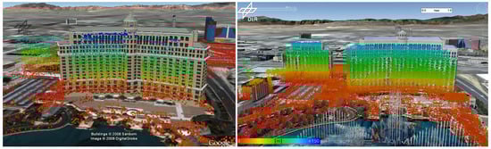 Figure 3. Comparison of the density of the 3D point cloud retrieved by PSI (left) and TomoSAR (right) of Bellagio Hotel, Las Vegas [8].
