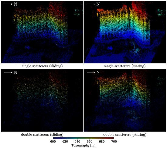 Another ROI contains two high-rise buildings (Hilton Grand Vacations on the Las Vegas Strip), which were chosen as a demonstration of layover separation. The mean intensity maps are shown in Figure 5b. Similarly, point-like targets stand out more prominently from clutter in the staring spotlight mode and the regularities on the building facades are more clearly visible. The TomoSAR point clouds of single and double scatterers are shown in Figure 6. For this ROI, a substantial increase in the number of (single and double) scatterers was also observed. The scatterer density in the staring spotlight mode is approximately 5.1 times as high, see Table 2. The number of double scatterers in the staring spotlight mode almost rivals the number of single scatterers in the sliding spotlight mode.