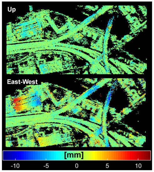 A natural step after the fusion of multiple D-TomoSAR point clouds from different aspects is the decomposition of the 1D LOS displacement vector into its original 3D motion components. A 3D deformation vector in a geographic coordinate system is highly beneficial to improving the interpretation of the deformation pattern. A 3D motion decomposition algorithm was proposed and validated on four TomoSAR point clouds in [54]. The method relies on either geometrical [39,43] or geodetic fusion [6,55] of multi-aspect TomoSAR point clouds as input. It estimates the 3D motion components of the queried point target by inclusion of observations from all different viewing geometries and robust inversion with 1 norm minimization in a local neighborhood. The method allows for highly detailed and shadow-free 3D deformation monitoring, as has been demonstrated in [54]. An example of seasonal motion decomposition on a small test site in Berlin is demonstrated in Figure 7, where it shows the vertical (up), and horizontal (east-west) linear deformation of a railway bridge.