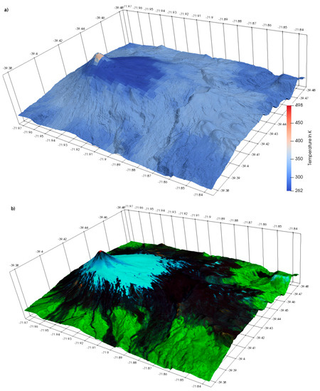 Villarrica Volcano observed on 22 February 2015: (a) The surface temperature derived from the atmospherically corrected TET-1 MWIR channel, overlaid on a TanDEM-X DEM. A minimum-maximum stretch over the observed values was applied. (b) Landsat-8 false color (SWIR2/NIR/GREEN) image, overlaid on a TanDEM-X DEM. The thermal hotspot at the Volcano summit is shown by red colors. Snow and ice covered areas appear in blue, bare rocks in black, and vegetated areas in green.