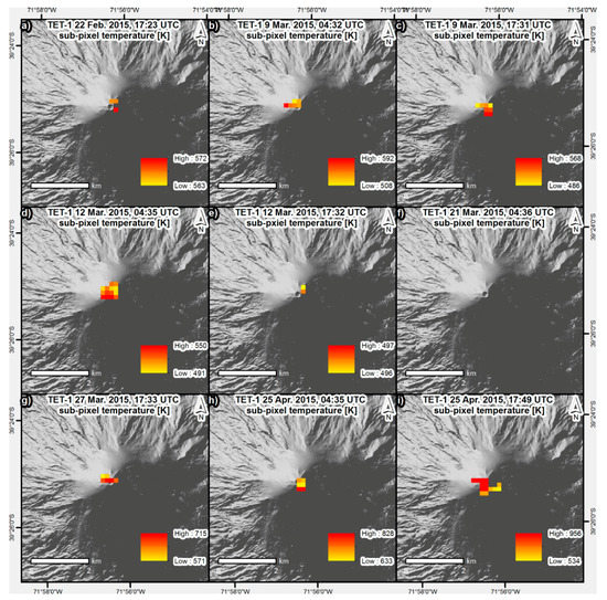 The subpixel analysis, described in Section 2.2.3, provides more details on the temperature of the hot parts, such as liquid lava at the summit crater lava lake. Figure 4 shows the temperatures at subpixel level for the detected hot objects. Three hotspots with temperatures up to 572 K were detected at the pre-eruption TET-1 acquisition (22 February 2015). The hotspot temperatures measured from 9 to 12 March 2015 vary from 486 K to 592 K. For the 21 March 2015 TET-1 acquisition, also showing the lowest MWIR surface temperatures (Figure 3f), no hotspots were detected. The acquisition of 27 March 2015 and the two acquisitions on 25 April 2015 show higher subpixel temperatures with up to 715 K, 828 K, and 956 K, respectively.