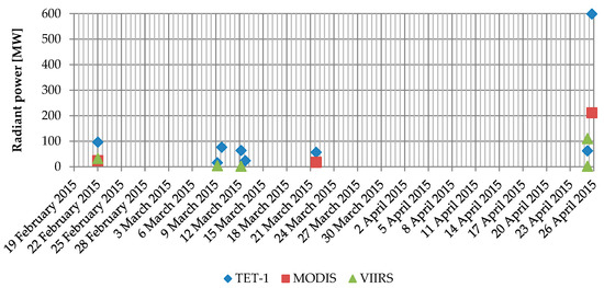 In addition, Table 5 and Figure 7 show the integrated radiant power of the MODIS [40] and VIIRS [41] acquisitions (derived from [42]) of the corresponding TET-1 acquisition dates. This table is discussed in detail in Section 4.