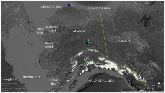 Alaska’s air quality monitoring (AQM) network used by AirNow.gov to provide current air quality index to the public on 22 August 2018 [6]. Green dots signify locations with good air quality. The following AQM locations are shown: (1) Bethel, (2) North Pole, (3) Fairbanks, (4) Anchorage, (5) Butte, (6) Eagle River, (7) Palmer, and (8) Juneau. The blue squares signify locations of the two AERONET stations, (9) Utqiagvik (Barrow), and (10) Bonanza Creek. Yellow line highlights the border between USA and Canada.