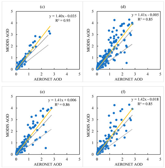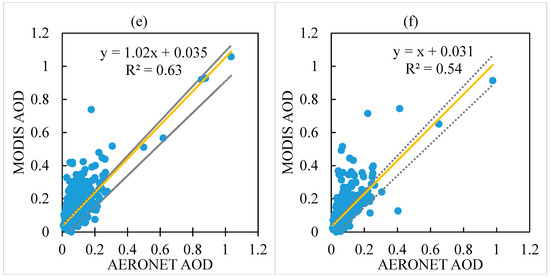 MODIS AOD versus AERONET AOD at the Bonanza Creek AERONET site with linear regression as solid yellow line and the dashed gray line as the error envelope where the following figures are for (a) Terra and Aqua 10-km combined, (b) Terra 10-km, (c) Aqua 10-km, (d) Terra and Aqua 3-km combined, (e) Terra 3-km, and (f) Aqua 3-km.