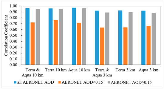 Overall, the full MODIS and AERONET AOD datasets were highly correlated with Pearson correlation coefficients (Figure 3) and thereby satisfied criterion 2. In Figure 2, the MODIS AOD and AERONET AOD do appear to be highly correlated, which is consistent with the calculated correlations shown in Figure 3. The Pearson correlation coefficients at 10-km resolution ranged from 0.95 to 0.97 for all AERONET AOD and AERONET AOD greater than or equal to 0.15, indicating high correlation. The Pearson correlation coefficient at 10-km resolution for AERONET AOD less than 0.15 ranged from 0.71 to 0.76 (highly correlated). The Pearson correlation coefficients of the 3-km data for all AERONET AOD and AERONET AOD greater than or equal to 0.15 ranged from 0.89 to 0.93 (highly correlated). The Pearson correlation coefficients for AERONET AOD less than 0.15 at 3-km resolution ranged from 0.64 to 0.66 (moderately correlated). The lower correlation coefficients for AERONET AOD less than 0.15 were most likely due to the greater uncertainty associated with lower AOD [31,32].