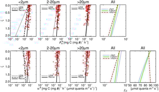 Relationship of and with respect to ζ for each size class using the retuned shelf model (black lines) with the models of Uitz et al. [] (dotted lines) and Brewin et al. [] (dashed lines). Values for light saturation parameter of retuned model in bottom right panel.