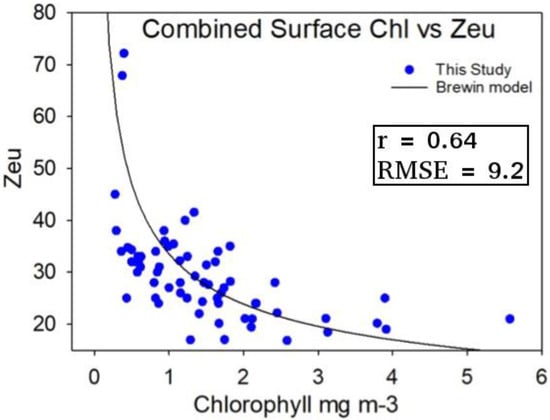 In situ measurements of surface Chl a and measured in the Western English Channel and Celtic Sea during four separate cruises (DY026, DY029, JR98, CD173) [,]. Equation (3) from the model of Brewin et al. [] is overlaid (black line) to indicate differences with the measured shelf sea data. r is the correlation coefficient between estimates from the Brewin et al. [] model and the data, and RMSE is the root mean square difference in meters, between the model and data.