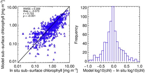 Figure 4 shows the improvement in model skill when making this assumption, with a Gaussian distribution in model differences. The distribution of observed versus measured values plotted via regression is more normal, with reduced bias and RMSE compared to the methods of Brewin et al. [], indicating that this parameterisation is more representative for the Celtic Sea and Western English Channel sites from spring to summer. The derived parameters for the revised shelf model were: = 0.432; = , ; and .