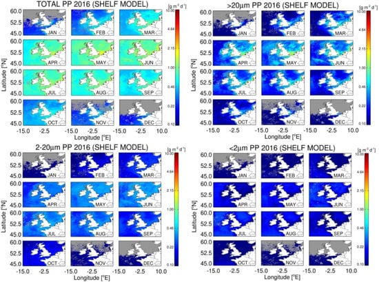 Total daily integrated primary production form the re-tuned Shelf satellite model peaked in April (Figure 6), with open shelf regions having values of 0.6–1.7 g m−2 d−1, with the highest values of 4–6 g m−2 d−1 in estuarine regions such as the Thames estuary, The Wash, The Rhine Delta and dominated by cells >20 µm; microphytoplankton. Nanophytoplankton (2–20 µm) PP was lower and more uniformly distributed than microphytoplankton with values of 0.3–0.5 g m−2 d−1 from April–August (Figure 6), even though they have similar photosynthetic rates to microphytoplankton (Table 1). Picophytoplankton account for the lowest proportion of total PP, which never exceeds 0.4 g m−2 d−1. As they are the least abundant fraction at high Chl a, they follow an inverse pattern to microphytoplankton in the distribution of their maximal PP, with lower PP in coastal regions and often relatively higher PP in off-shelf areas.