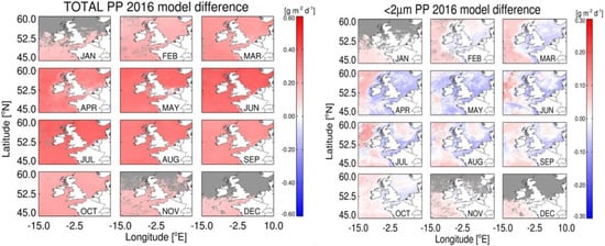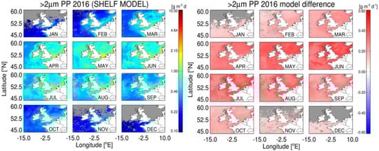 Estimates of monthly micro + nanophytoplankton PP using the Shelf Sat model (left panel) and the difference in micro + nanophytoplankton PP estimated by the Shelf Sat and Open Sat models (right panel).