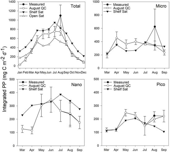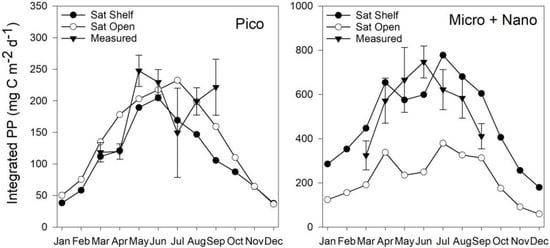 Generally, the Shelf Sat model captured the seasonal dynamics of picophytoplankton PP better between March–July, but PP values were overestimated, whereas the Open Sat model returned values closer to the climatological means. Combined micro and nanophytoplankton PP is generally better estimated by the Shelf Sat model, though is often overestimated outside of May and June. The Open Sat model consistently underestimated micro and nanophytoplankton PP.