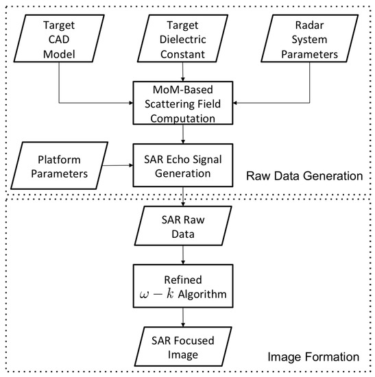 Figure 3 illustrates a functional block diagram of an SAR image simulation. The simulation processing flow is adopted from [13]. Generally, the inputs include the platform, radar parameter settings, and target CAD model. Then, the scattering fields are calculated within different platform positions, and the echo signal can be generated in two dimensions. An imaging algorithm is applied to achieve the final focused image.