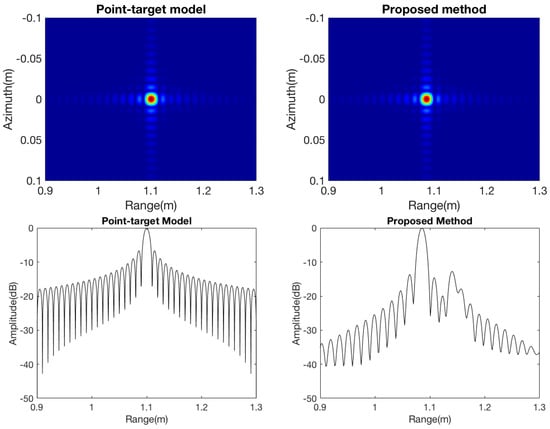 Comparison of focused images between the point-target model and the proposed method: Top row (left: point-target model and right: proposed method); bottom row: range profile (left: point-target model; right: proposed method).