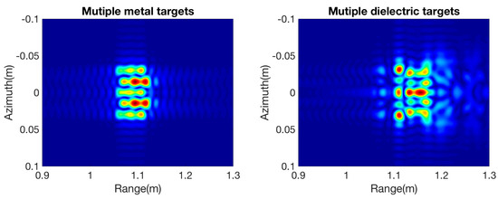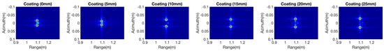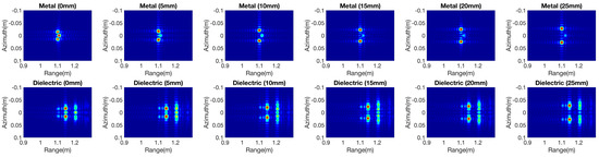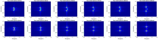 In the proposed method, simulations of metal, dielectric and coatings (metal coated with Teflon) for two targets are used to evaluate their interaction. Two spheres were separated along the azimuth direction, with spacing of 0 mm, 5 mm, 10 mm, 15 mm, 20 mm and 25 mm. The focused images in Figure 8 present the interaction among the targets. The case of two metal spheres features not only the two targets but also their mutual effects. The interactions are stronger with smaller displacement spacing and become weaker as the spacing increases. Due to the effects of transmission, scattering, and multi-path interactions, the results show more complex information in the dielectric object case. It is clear that multidelays are demonstrated in the range direction, which include the different levels of interactions with the spacing changes. In the case of coated spheres, only part of the power is scattered back because of the inner metal sphere. The level of interaction is weaker than for the pure metal targets. By testing different types of material, different degrees of interaction among targets can be analyzed in the simulations.