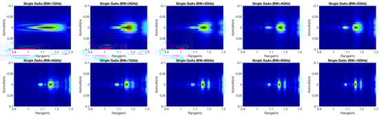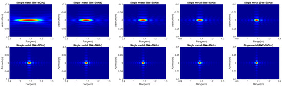 SAR simulation could be a key to supplying system designers with possibilities that optimize radar components and assist in applications such as signal generation and analysis. The modular and flexible simulation structure allows adjustment and expansion for different tasks. SAR simulation tools are typically used to design SAR systems in the form of parametric studies that consider topics such as the prediction of image quality parameters. From the aspect of simulation, the system bandwidth is an important parameter in radar system design and is relative to the range resolution in the focused image. As the radar bandwidth increases, the electromagnetic interaction of a target can be resolved to varying degrees depending on the radar bandwidth. Hence, electromagnetic characteristics according to the variation in bandwidth in different materials are discussed. In the case of a single metal object, the radar bandwidth changes from 1 GHz to 10 GHz are shown in Figure 10. Because of single scattering behavior in a single metal target, the results show the bandwidth changing with little influence. Only the range resolution changes with the variation in bandwidth.