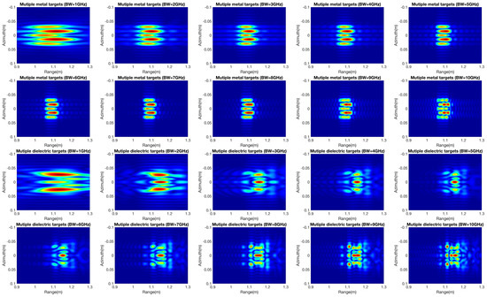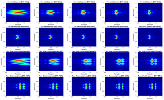 The effect of the system bandwidth on two targets is also discussed. Two different kinds of metal and dielectric objects are simulated with no spacing between targets. As shown in Figure 12, when the system bandwidth is lower, the ability to differentiate between metal and dielectric objects is poor, but their mutual interaction can still be illustrated. Moreover, the bandwidth changes only affect the resolution variation because of electromagnetic wave nonpenetration for the two metal objects. On the other hand, bandwidth alternations strongly affect the multipath imaging of a dielectric material. In addition, more complex objects are used for analysis of the system bandwidth. Both metal and dielectric materials with three-by-three spheres are placed along the range and azimuth directions with no spacing between objects. In the focused images of the metal spheres, the targets with mutual interaction in the azimuth direction can be clearly identified, and the targets in the distance image cannot be recognized as three objects because of lower resolution in the range direction. As the system bandwidth increases, the mutual interactions in the different levels are presented with the corresponding resolution. For the dielectric materials shown in Figure 13, different degrees of electromagnetic interaction are delivered with the variation in system bandwidth.