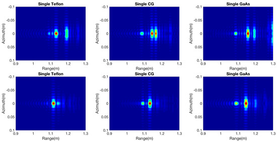 In addition, the cases of multiple layer materials are analyzed with three different coating spheres. In these three spheres, the inner radius is 0.75 cm, and the materials are metal, glazed ceramic and GaAs. All the spheres are coated with 0.75 cm of Teflon. After raw data generation and imaging processing, the final focused images are presented in Figure 6. In the case of the metal sphere coated with Teflon, the scattering behavior presents as a single metal sphere, but the creeping wave phenomenon vanishes because of the coating layer. In the case of glazed ceramic coated with Teflon, only the first bounce and a single boundary reflection occur, and the penetration energy decreases rapidly. In the third case, because of the large difference in the dielectric constant, the scattering is dominated by the inner GaAs sphere.