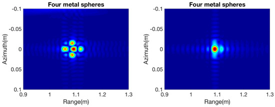 Two-by-two metal targets placed along the range and azimuth directions are shown in monostatic and bistatic modes in Figure 16. Two spheres are set with no spacing in the azimuth direction, and another two are five lambdas (0.0205 m) apart in the range direction. The monostatic case shows that original targets can still be identified with strong interaction in their centers. The interaction response is enhanced with the interaction in both the range and azimuth directions. As a result of the enhanced mutual interaction intensity, only the interaction is shown in the focused image, and the target recognition ability is reduced.